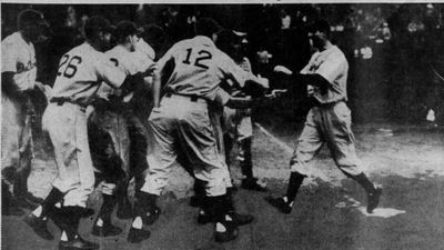 “Potter wound up and threw a high fast one toward the plate. Hank hit the ball on a line out of the field and into the left field stands at the 351-foot mark to drive home Red Borom, Skeeter Webb and Doc Cramer. By the time Hank reached home plate, he was caught up in a maelstrom of humanity that was every Tiger on the team. He was hugged and roughed and kissed and pummeled.”
